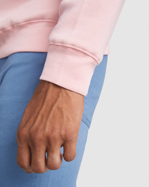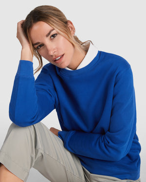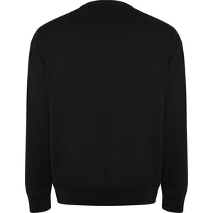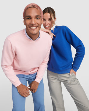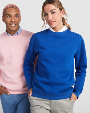 Felpa unisex in cotone organico pettinato e poliestere riciclato. Collo, polsini e girovita a costine 2x1. Cuciture ricamate su spalla, giromanica, collo, polsini e girovita. Mezzaluna all'interno della parte posteriore del collo.