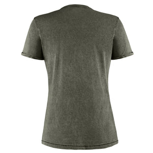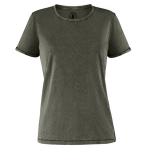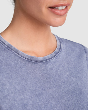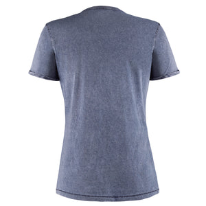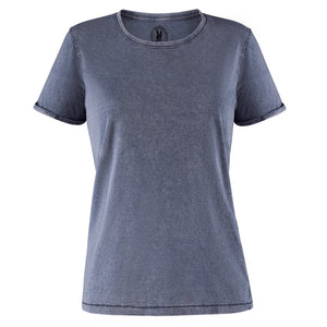 T-shirt manica corta effetto jeans per donna. Girocollo in costina 1x1, con copri cuciture rinforzate da spalla a spalla. Doppia cucitura sul giromanica. Manica con orlo.